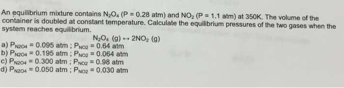 An equilibrium mixture contains N2O4 P 027 and NO2 P 10 at 350 K. Calculate the equilibrium pressure of N2O4 and NO2 When the system reaches a new equilibrium. A Write the mathematical expression for the equilibrium constant.